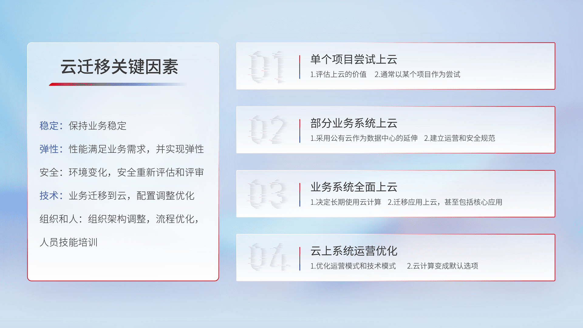 结合实际业务,,从规划设计、、、、云平台选型、、、、云原生改造、、、、数据迁移、、、、集成交付,,,迁移全过程为客户识别最佳上云路径,,,,做好风险识别管理,,,,设计网络架构、、、身份权限、、安全审计合规、、操作审计、、、、日志审计、、、、监控告警策略、、多站点容灾设计等,,,对云上基础设施进行整体规划,,,提升IT治理水平,,,以满足弹性、、、、高可用、、、、高性能的需求。。